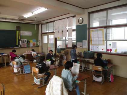 今日の3校時、ろ組では国語で伝わる表現を選ぼうの学習でした。1年生は、体育館で作品展の鑑賞をしていました。2年生は、算数のテストを頑張っていました。