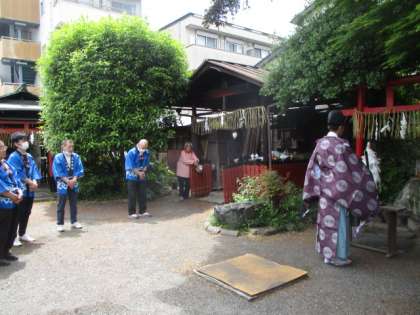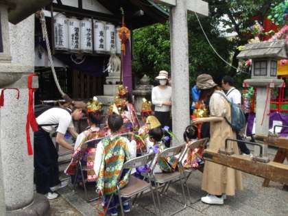 今日5月5日は、毎年恒の校区内にある石井神社大祭の日です。正午より境内にて神事祭典が行われ、稚児たちが本殿に向かって礼拝をしていました。天気にも恵まれ、今日はたくさんの人たちが参加していました。