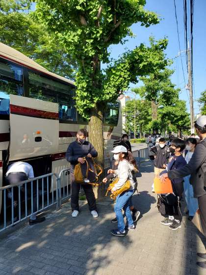 バスに荷物を預けている様子です。みんなを乗せたバスは、予定時刻に出発しました。