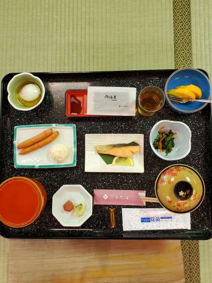 おはようございます。今日の香川県は、とてもいい天気です。写真は朝食のメニューですが、かなりのごちそうが並んでいます。