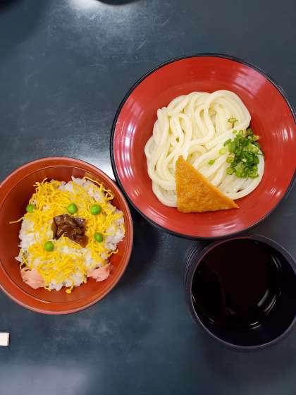 今日の昼食メニューです。うどんはだしにつけるのではなく、ぶっかけて食べます。