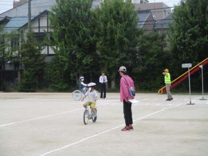 今日は天候が少し心配でしたが、自転車安全教室を実施することができました。北警察署ならびに北地域交通安全活動推進委員会の方にお世話になり、安全に自転車を運転するための知識や技能などを教えていただきました。写真は、3年生の様子です。普段乗っている自転車とは違いましたが、丁寧に運転する様子が見られました。