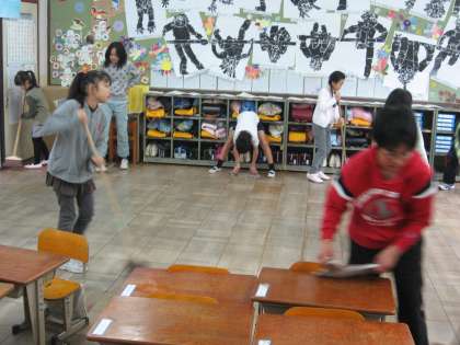 5・6年生のお友だちが1・2年生にそうじの仕方を教えながら