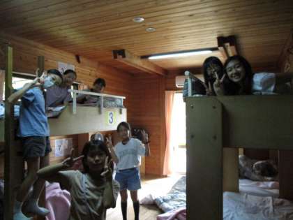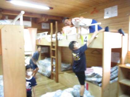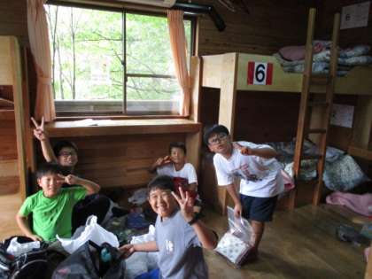 シーツを受け取った後に、宿泊棟へ行き荷物整理をしました。みんなそれぞれ自分たちの部屋で楽しく過ごしていました。この後は、予定通り入浴を済ませてから夕食、そしてナイトハイクと続きます。子どもたちはとても元気にしています。