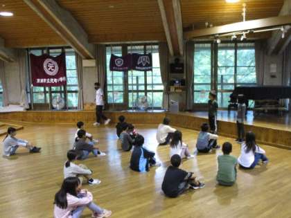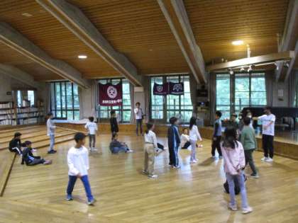 おはようございます。今日の花背山の家は、朝から霧雨のような雨が降っていましたが、今はやんでいるので天狗杉登山も予定通り行う方向です。昨晩はなかなか眠れない子どももいたようですが、体調不良やケガも特にないので安心しています。こちらは、朝の集いの様子ですが、ふとホール近くに鹿が2頭いました。