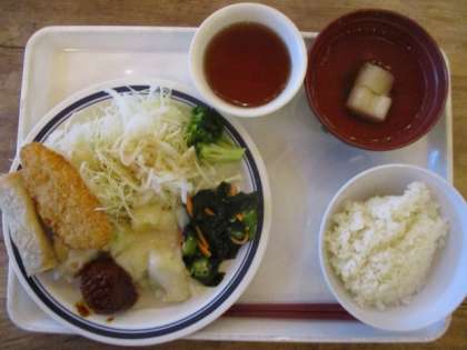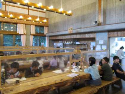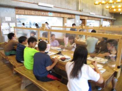 今日の夕食メニューです。ささみフライやハンバーグ、野菜春巻などおいしいおかずがたくさんありました。子どもたちは、登山帰りということもあってたくさん食べていました。