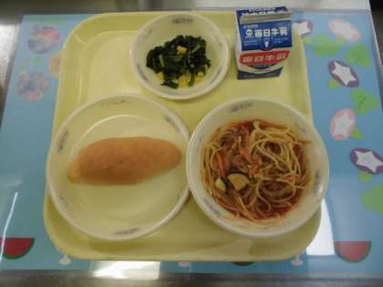 今日のスパゲティのミートソース煮には、ズッキーニが入っていました。ミートソースは給食室での手作りで、おいしくいただきました。