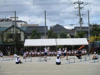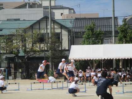 こちらは、4・5・6年生のハードル走です。学年が上がるにつれて、ハードルをまたぎ越すスピードが速かったです。