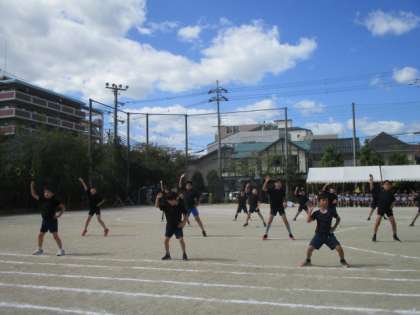 こちらは、3・4年生の団体演技の様子です。みんな元気いっぱい動いていましたし、ソーランのかけ声も運動場に響き渡っていました。