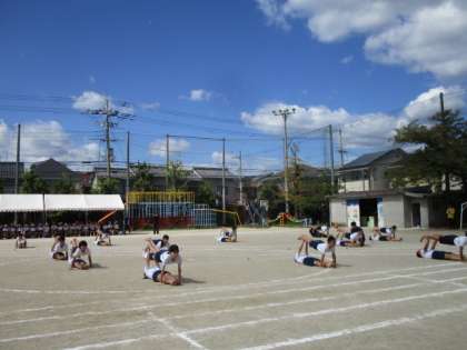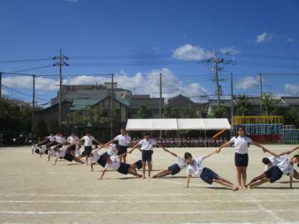 こちらは、5・6年生団体演技の体操部分の様子です。腕をピンと伸ばし、顔もしっかりと上げて堂々と演技できていました。6年生にとっては最後の運動会でしたが、本番での活躍だけでなく前日準備もみんなで協力しながら頑張っていました。さすが元町の6年生、お疲れ様でした。今後も最高学年として、1年生から5年生までリードしてほしいと思います。