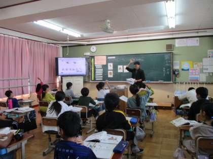 5年生は、英語担当の先生が外国語科He can run fast.She can do Kendama.の学習を進めていました。6年生は、書写担当の先生が文字の大きさと配列、点画のつながりの学習を進めていました。