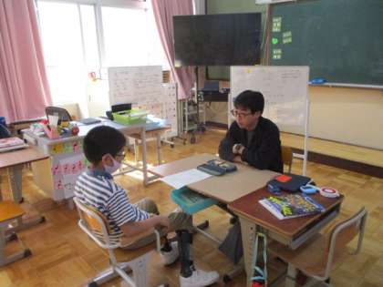 今日の3校時、ろ組は学習発表会にむけての話し合いをしていました。1年生は、書写担当の先生が文字のかたちの学習を進めていました。2年生は、体育でとびあそびの学習でした。