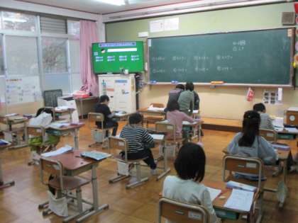 今日の5校時、ろ組は算数で図形の拡大と縮小の学習でした。1年生は、算数でたし算のまとめをしていました。2年生は、体育でマットあそびの学習でした。