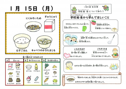 1月の給食目標は、「学校給食について知ろう」です。今日の給食カレンダーには、学校給食から学んでほしいことについてでした。何気なく食べている学校給食からもたくさんのことを学んでほしいと思います。