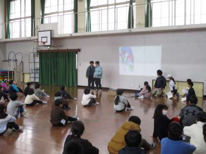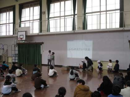 今日は、昼休み後のもっともっとタイムで児童集会を行いました。運動委員会や栄健委員会、図書委員会からの発表がありました。