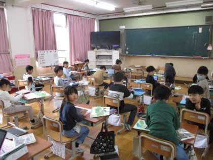 今日の3校時、ろ組は図工で版画制作をしていました。1年生は、図書室で静かに読書をしていました。2年生は、図工でまどからこんにちはの学習でした。