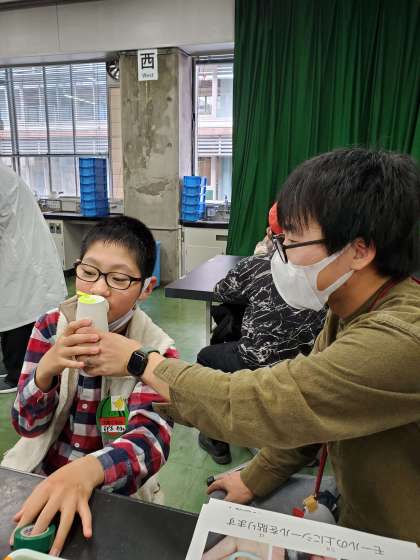 無事に科学工作が出来上がり、声を出すとコップの上にあるモールが動きました。