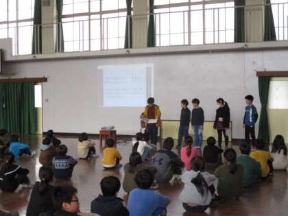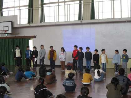 今日のもっともっとタイムで、今年度最後の児童集会を行いました。委員会からのお知らせの後に、各学年の代表委員の子どもたちが前に出て最後のあいさつを行いました。1年間本当にお疲れ様でした。