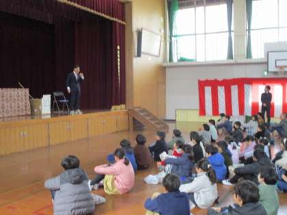 今日は教職員離任式と管理職離任式があり、こちらは管理職離任式の様子です。本校教頭が、子どもたちに熱いメッセージを明るく楽しく伝えていました。卒業生のみなさんは、中学校という新天地で、在校生のみなさんは、その言葉を胸に4月からも元気に元町小学校で頑張ってください。