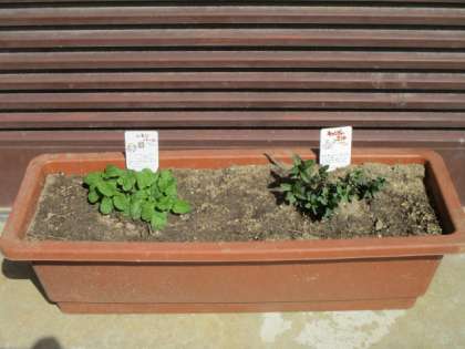 先月くらいからカメムシが校内でよく見つかったので、その対策としてミントが有効であるとのことなので、この4月からミントハーブを育てています。よく見かける給食室の入り口付近に2種類のミントハーブを植えています。防虫効果だけでなく、この近くはいい香りがするのかも…。
