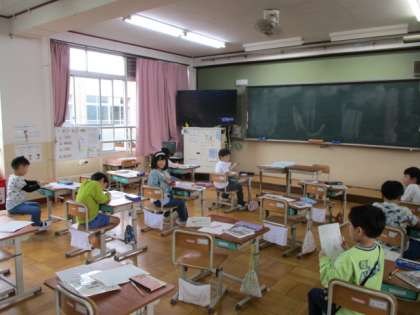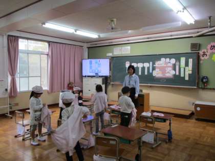 今日の4校時、1年生は初めての給食なので栄養教諭からのお話を聞いた後に、エプロンの着方を教わっていました。2年生は、学校内の教室案内カードをみんなで協力しながら作っていました。