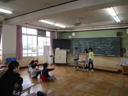 5年生は、明日の1年生を迎える会の練習をしていました。6年生は、外国語科でThis is me.の学習でした。