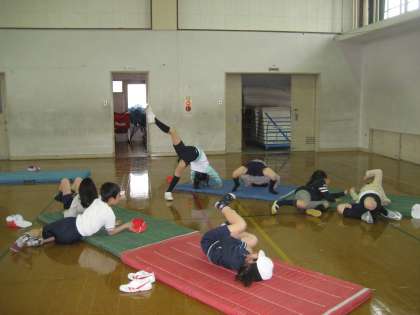 マット運動のための準備運動をしました。いろいろな動きをして体ほぐしをしました。