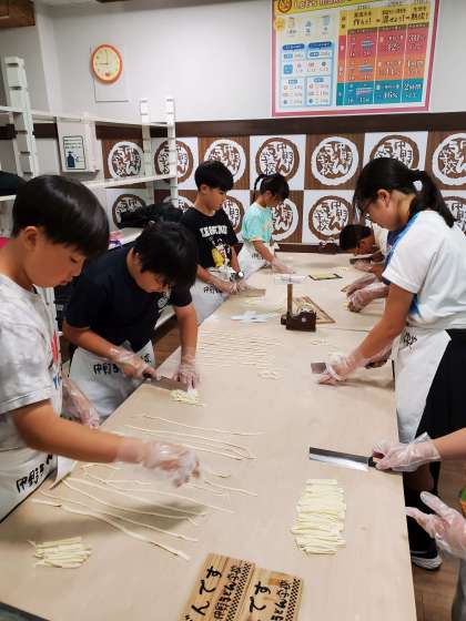 中野うどん学校の様子です。子どもたちは、うどんの生地を伸ばしています。