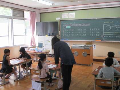 今日の2校時、1年生は算数でいくつといくつの学習でした。2年生は、2校時は体育でしたが3校時は算数で長さの学習でした。