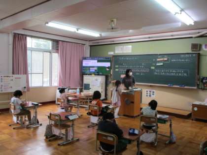 今日の3校時、1年生は算数でちがいはいくつの学習でした。2年生は、算数のテストが終わりタブレットのドリルに取り組んでいました。