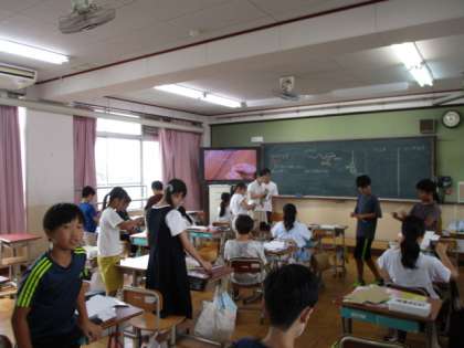 5年生は、理科で植物の成長を確かめる観察をしていました。6年生は、図工でくるくるクランクの学習でした。