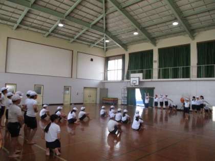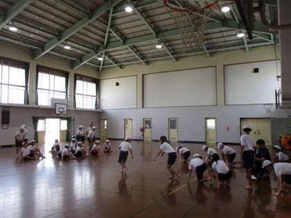 5・6年生は、体育で運動会の団体演技の練習をしていました。グループに分かれて、曲のリズムに合わせて動きを練習していました。