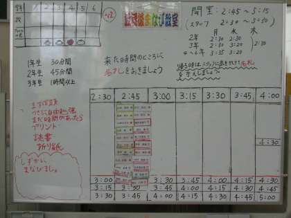 名札をホワイト・ボードにはり,来た時刻と帰る時刻を確認します。