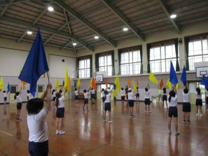 5・6年生は、合同で運動会の団体演技の練習をしていました。子どもたちの旗の動きもだいぶそろってきたように思います。