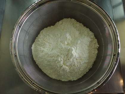バターが溶けたところへ小麦粉をふるいながら加えて,