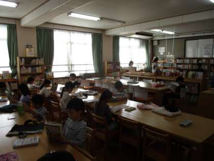 今日の5校時、1年生は音楽でせんりつでよびかけあおうの学習でした。2年生は、図書室で読書をしていました。