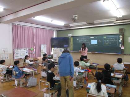 今日の3校時、1年生は体育でころがしドッジボールの学習でした。2年生は、算数で三角形と四角形の学習でした。