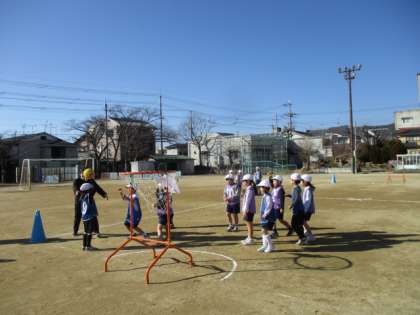 今日の2校時、1年生は紫竹小で合同体育パスゲームを行いました。たいへん寒い日でしたが、元町小だけのチームで参加し、みんなで声をかけて協力しながら熱心に頑張っていました。