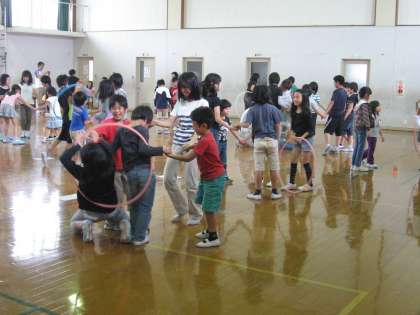次に,みんなで手をつないで,フラフープを移動させるゲームです。
