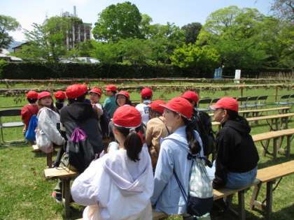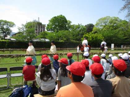 今日の午後に、6年生は上賀茂神社へ行って伝統的行事である競馬の足汰式に参加しました。本校以外にも数校が参加し、実際に馬が走る様子を間近で見させていただきました。