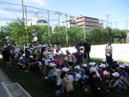 今日は、とてもいい天候のもとで全校遠足を実施しました。暑さが心配でしたが、特に体調を崩す子はいませんでした。出発式の様子です。