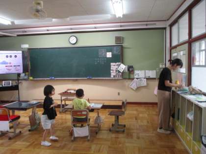 今日の5校時、ろ組はそれぞれで授業の準備をしていました。1年生は、国語でひらがなプリントをしていました。2年生は、体育でまねっこあそびの学習でした。