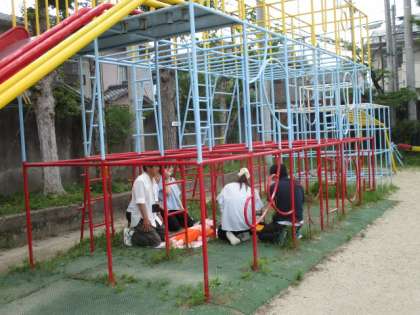 今日の放課後に、教職員で緊急対応実地訓練を行いました。中間休みに子どもが総合遊具から落下して徐々に意識が弱くなることを想定し、職員室内本部と現場対応との連携を意識しながら訓練を行いました。実施後は本部と現場対応でふり返りを行い、教職員からたくさん意見が出てきたので、このことを今後に生かしながら子どもの命をしっかりと守れるように教職員全員で努めていきます。