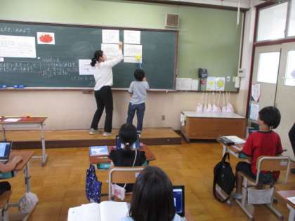 授業の後半では、グループで問題づくり・図をつくる・式をつくるに分かれて問題づくりに取り組んでいました。今回も昨年度に引き続き特別訪問指導員の青山先生から指導助言をいただき、対話の実現のために教師力や発問についてどう考えればよいかなどのお話をしていただきました。
