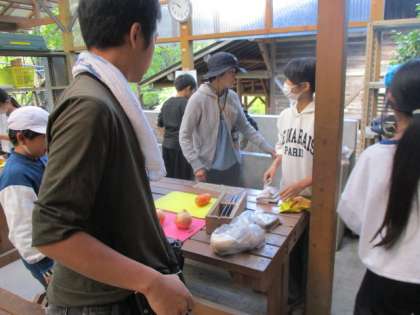 野外炊事カレーライスが始まりました。山の家の所員の方からかんたんな説明があり、その後は係ごとに活動していきました。1日目に野外炊事を経験しているので、みんな手際よく動いていました。