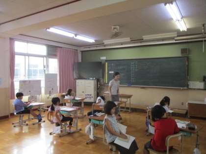 今日の5校時、ろ組は育てている野菜の様子を見た帰りに出くわしました。1年生は、国語で教育実習生がまちがいをなおそうの学習をしていました。2年生は、算数で3の段のかけ算の学習でした。
