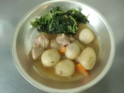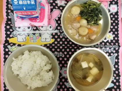 鶏肉と里いものあまから煮,小松菜のごまいため,みそ汁」