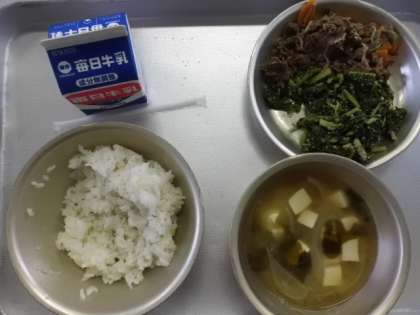 「麦ごはん,牛乳,牛肉のしぐれ煮,だいこん葉のごまいため,みそ汁」