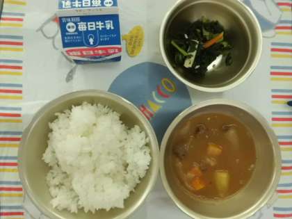 「ごはん,牛乳,ビーフシチュー,小松菜のソティ」