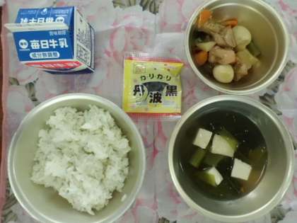 「麦ごはん,牛乳,プリプリ中華いため,とうふと青菜のスープ,黒大豆」